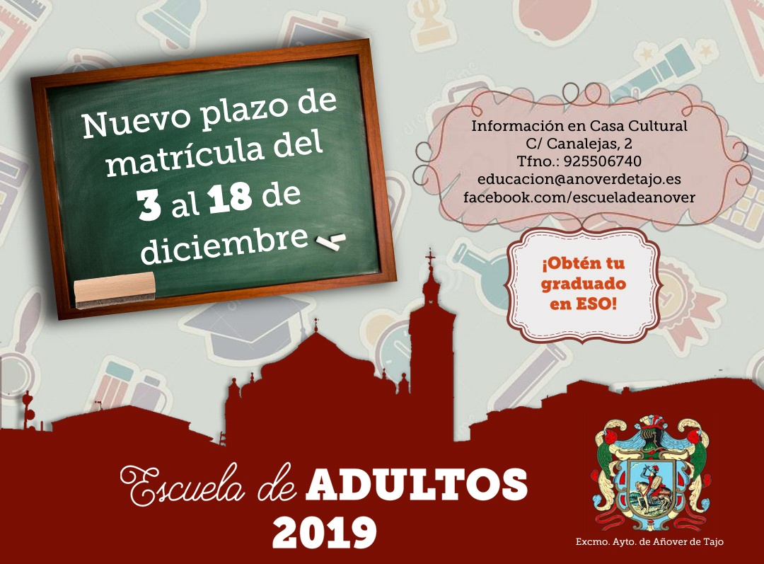 El Ayuntamiento de Añover de Tajo te informa de que se abrirá un plazo de matriculación en la Escuela municipal de Adultos del 3 al 18 de diciembre. Así que si estás interesado en obtener tu Graduado en ESO, ¡no dudes en inscribirte!