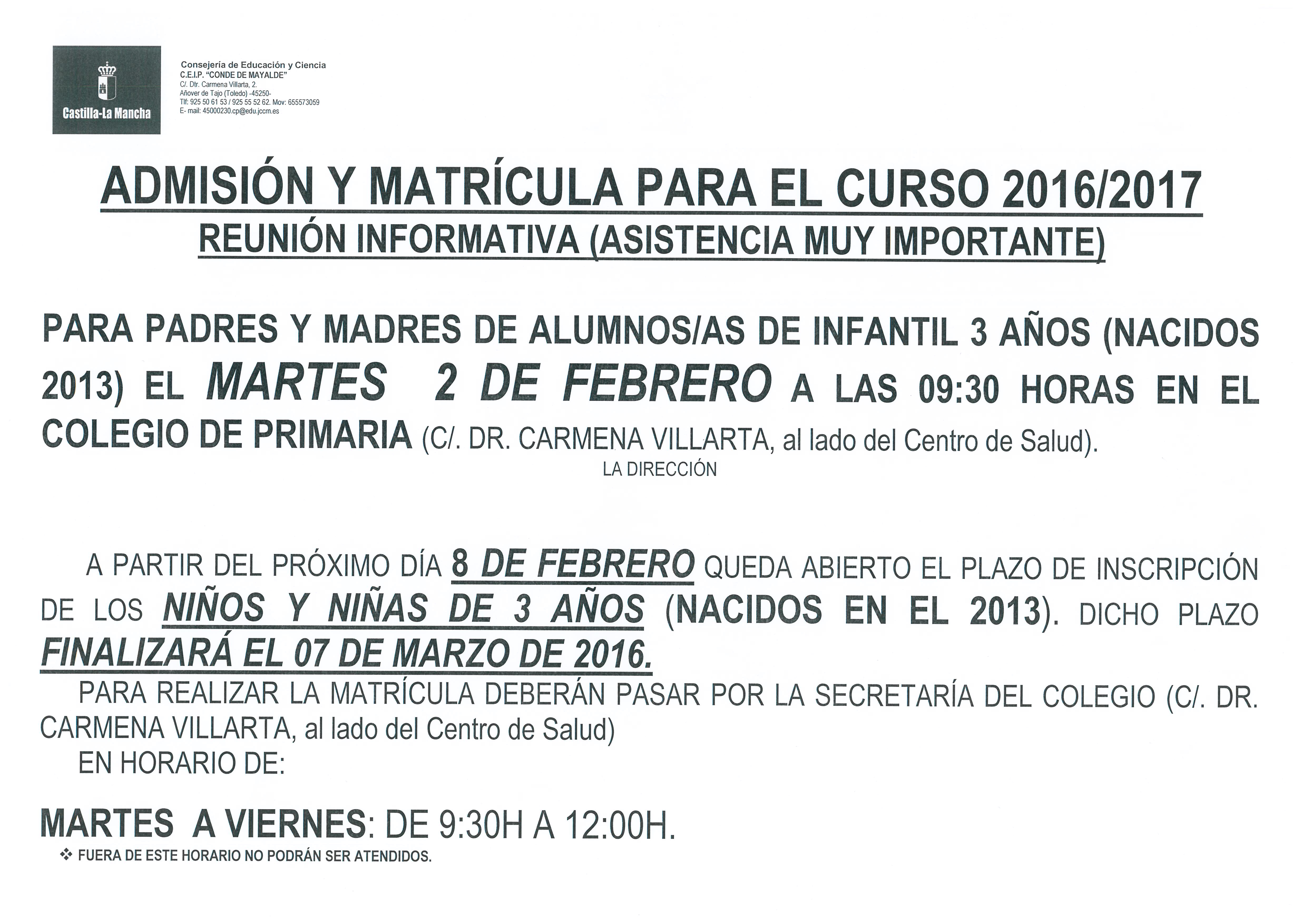 El centro educativo “Conde de Mayalde” organiza una reunión informativa para los padres de sus futuros alumnos de 3 años (nacidos en 2013). La reunión se llevará a cabo el próximo 2 de febrero a las 9:30 horas en el Colegio de primaria (calle Dr. Carmena Villarta, al lado del Centro de Salud). Es importante la presencia de los padres.
