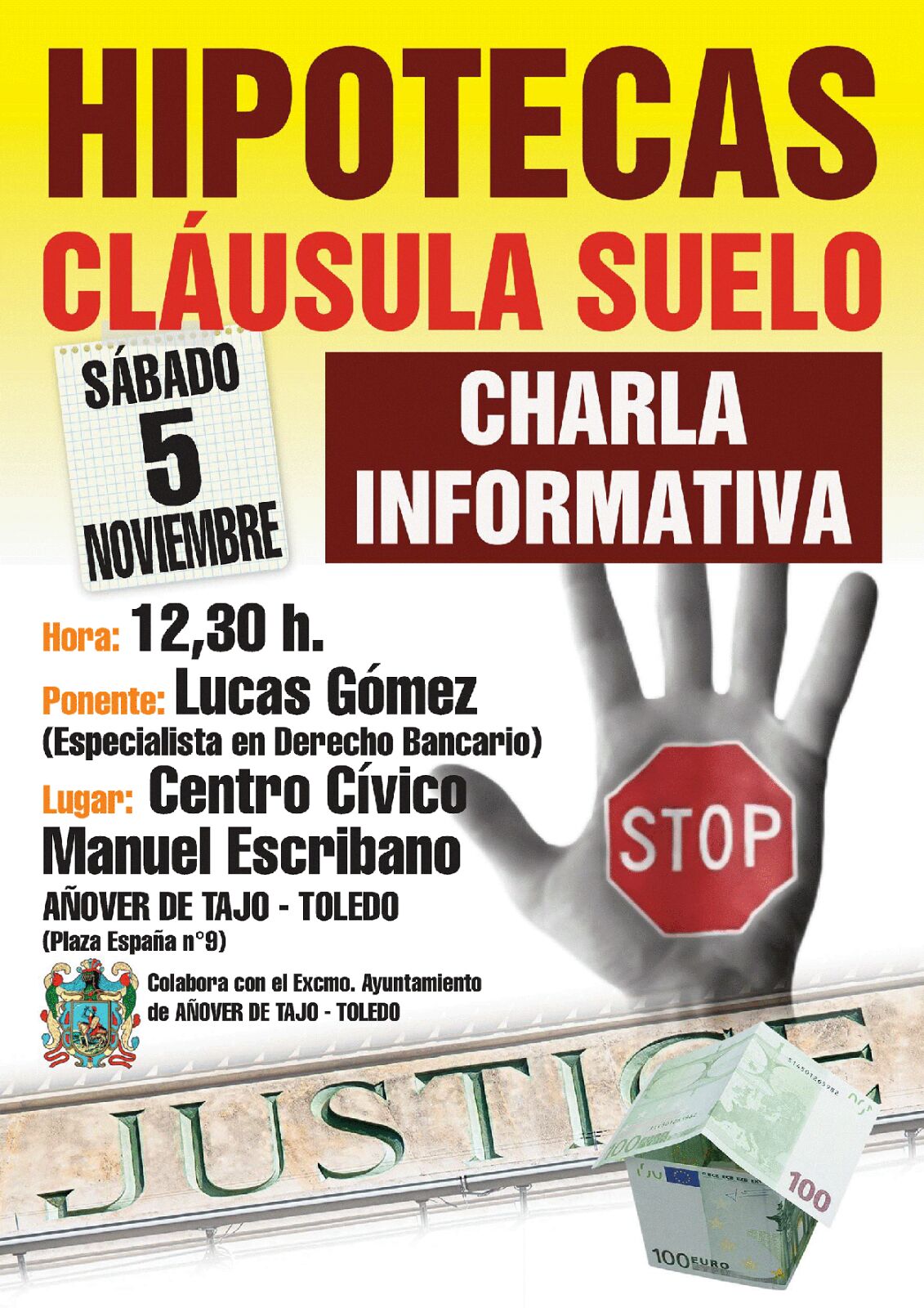 El próximo sábado 5 de noviembre el especialista en Derecho bancario, Lucas Gómez, ofrecerá una charla en el Centro Cívico donde explicará cómo actuar si nuestra hipoteca tiene una cláusula suelo. Esta cláusula evita que la tasa de interés cobrada por el banco descienda más allá de un límite impuesto por la entidad y no acompañe a la tasa de referencia (Euríbor), cuando esta es menor que ese «suelo».