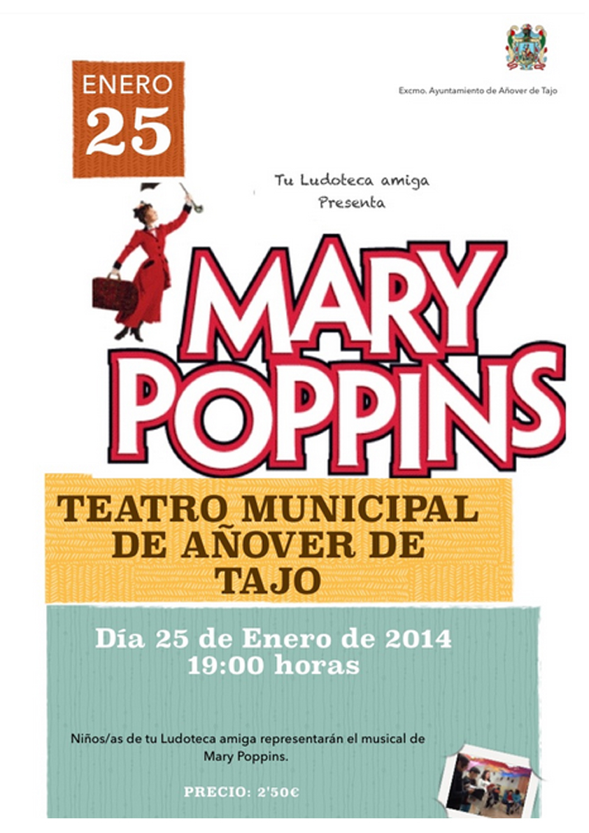 El sábado 25 de enero, a las 19:00 horas, los niños/as de Tu Ludoteca Amiga representarán el musical ‘Mary Poppins’ en el Teatro Municipal de Añover de Tajo.