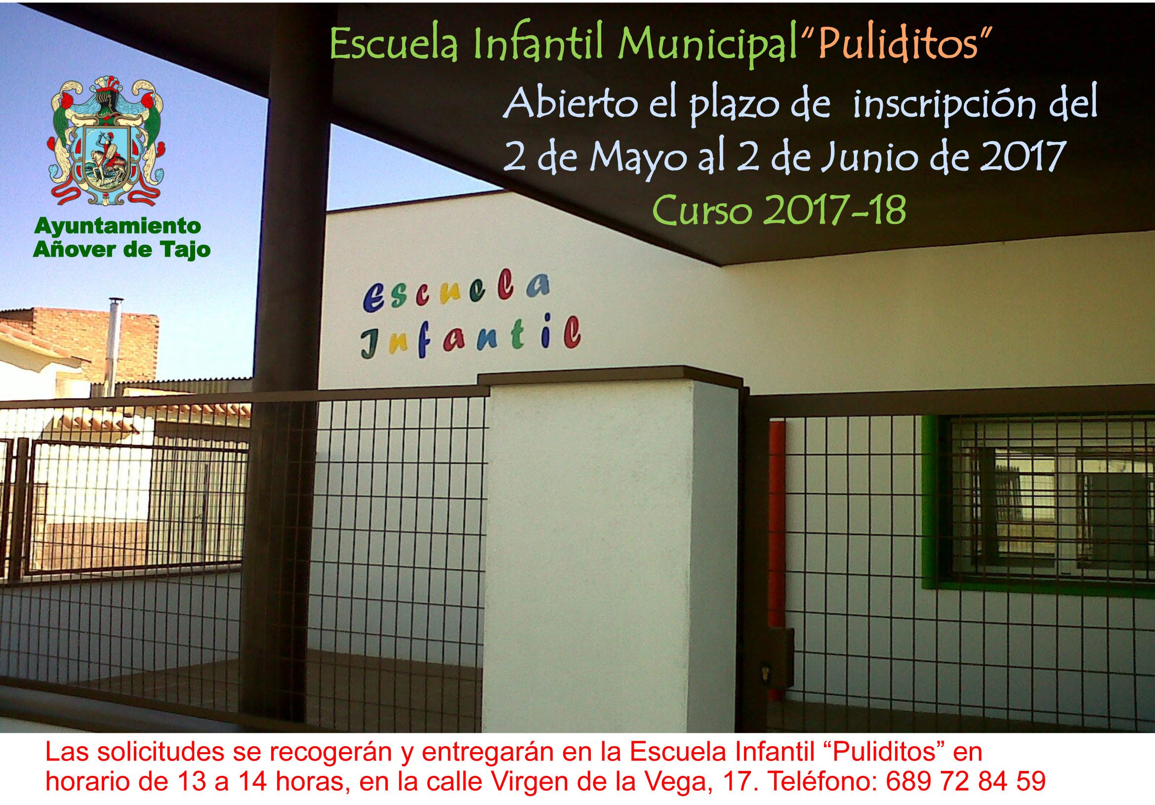 Inscripción Escuela Infantil Community hace 9 años «Puliditos» abre el periodo de inscripción para el curso 2017-2018. Las solicitudes se recogerán y entregarán en la Escuela Infantil Municipal “Puliditos” en horario de 13 a 14 horas. Calle Virgen de la Vega, 17. Teléfono: 689 72 84 59.