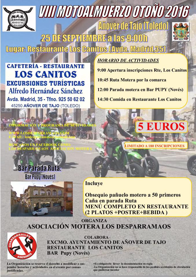 El próximo domingo 25 de septiembre, la asociación motera «Los Desparramaos», con la colaboración del Ayuntamiento de Añover de Tajo, organiza su motoalmuerzo de otoño. El evento incluirá una ruta motera por la comarca y un almuerzo en el restaurante Los Canitos, de Añover de Tajo.